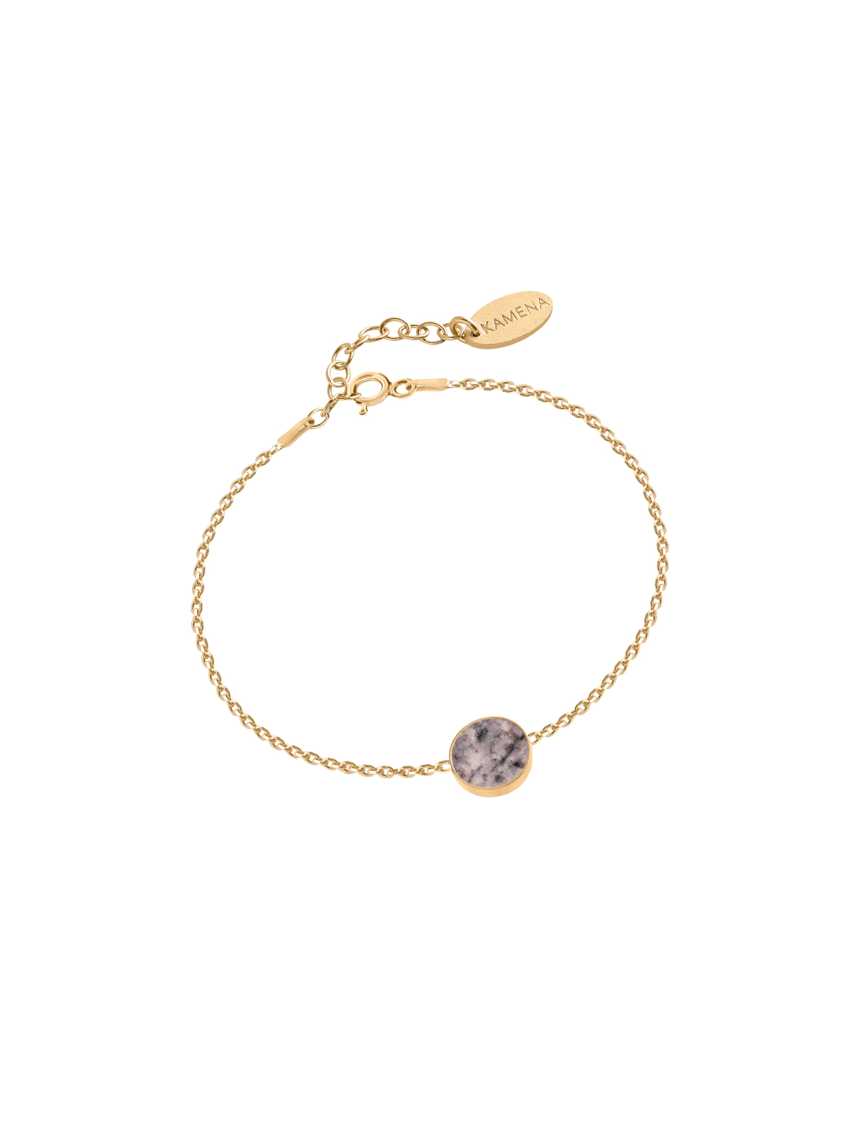 At its center sits a natural pink stone from Poland, blending soft blush tones with delicate darker veins. Each piece features a slightly different pattern, making every bracelet unique.