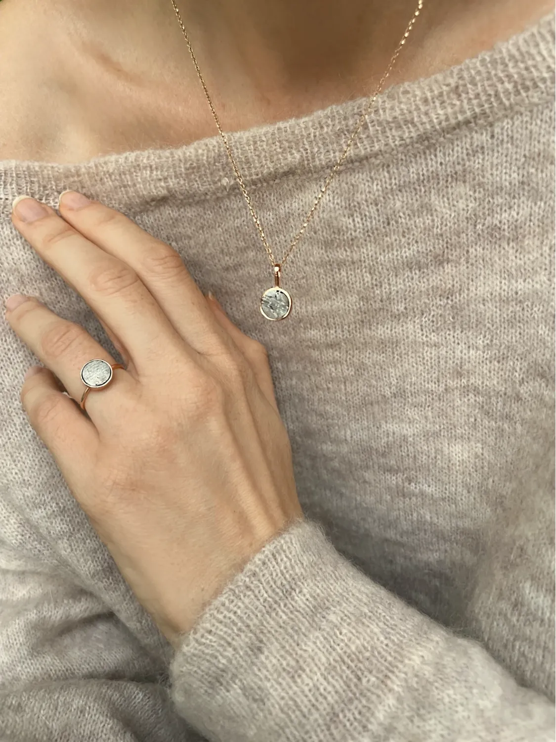 Each meteorite is one of a kind and may contain natural inclusions and micro-cracks. Over time, its surface may subtly evolve, creating a personal bond with the person who wears it.