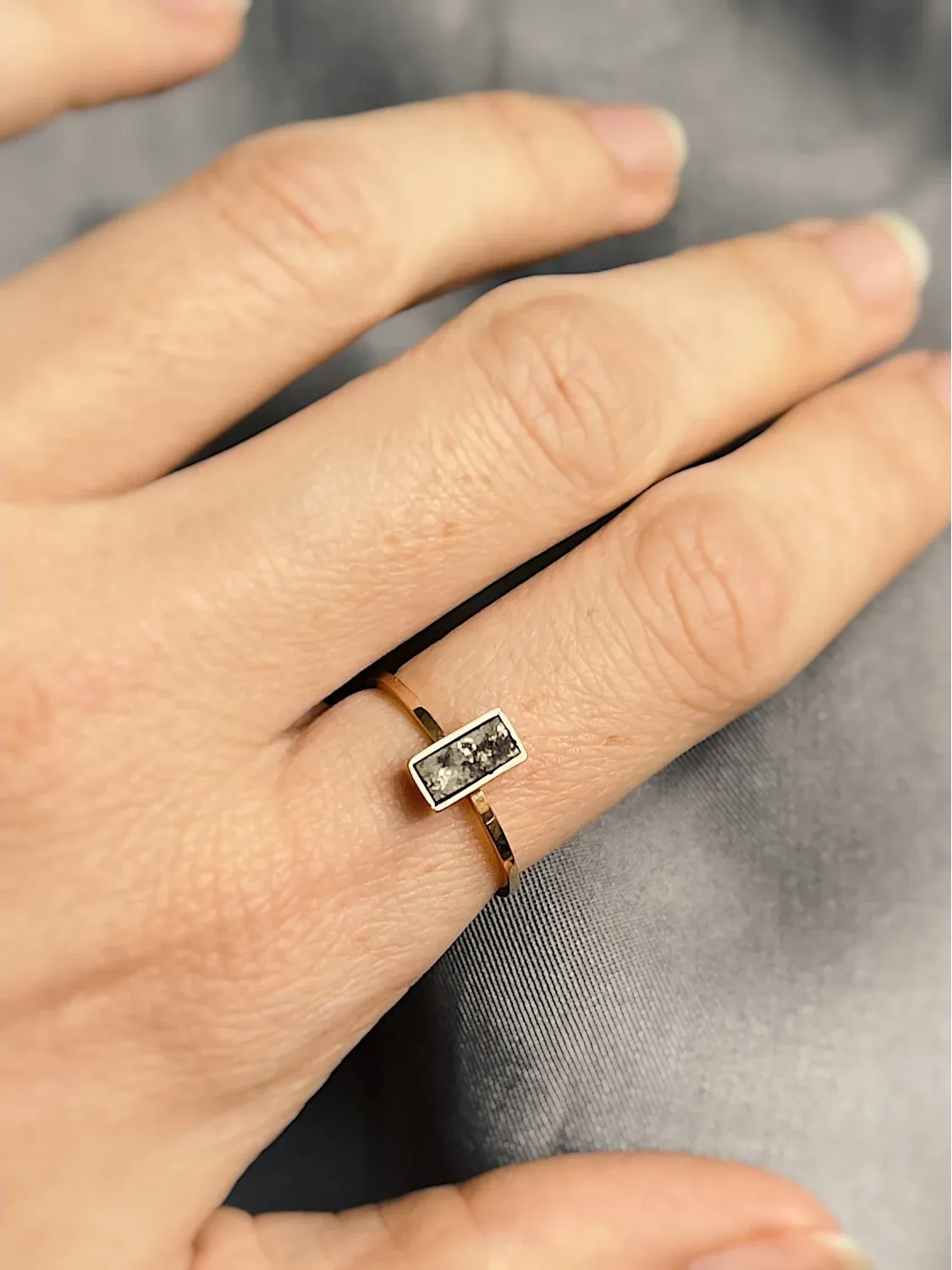 This ring is not from this Earth — quite literally. At its center sits an authentic fragment of a meteorite that fell in the Morasko area, like a fallen star from the sky. The rectangular meteorite setting and the delicate rose gold band come together in a hand-crafted ring — jewelry filled with symbolism, emotion, and timeless elegance.